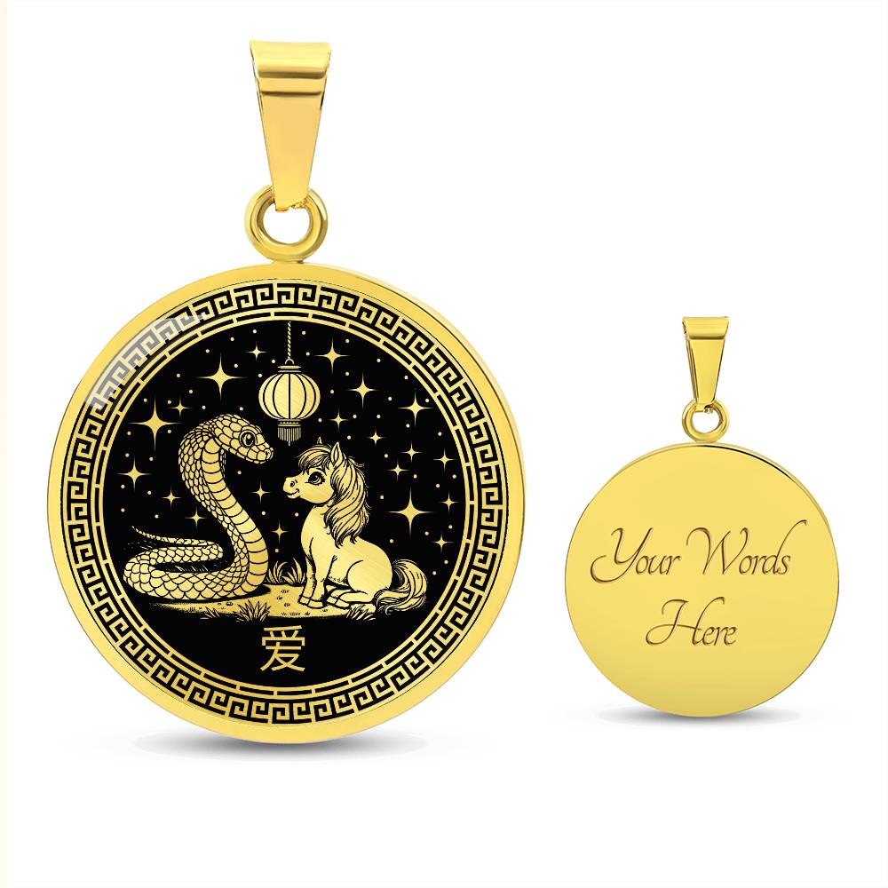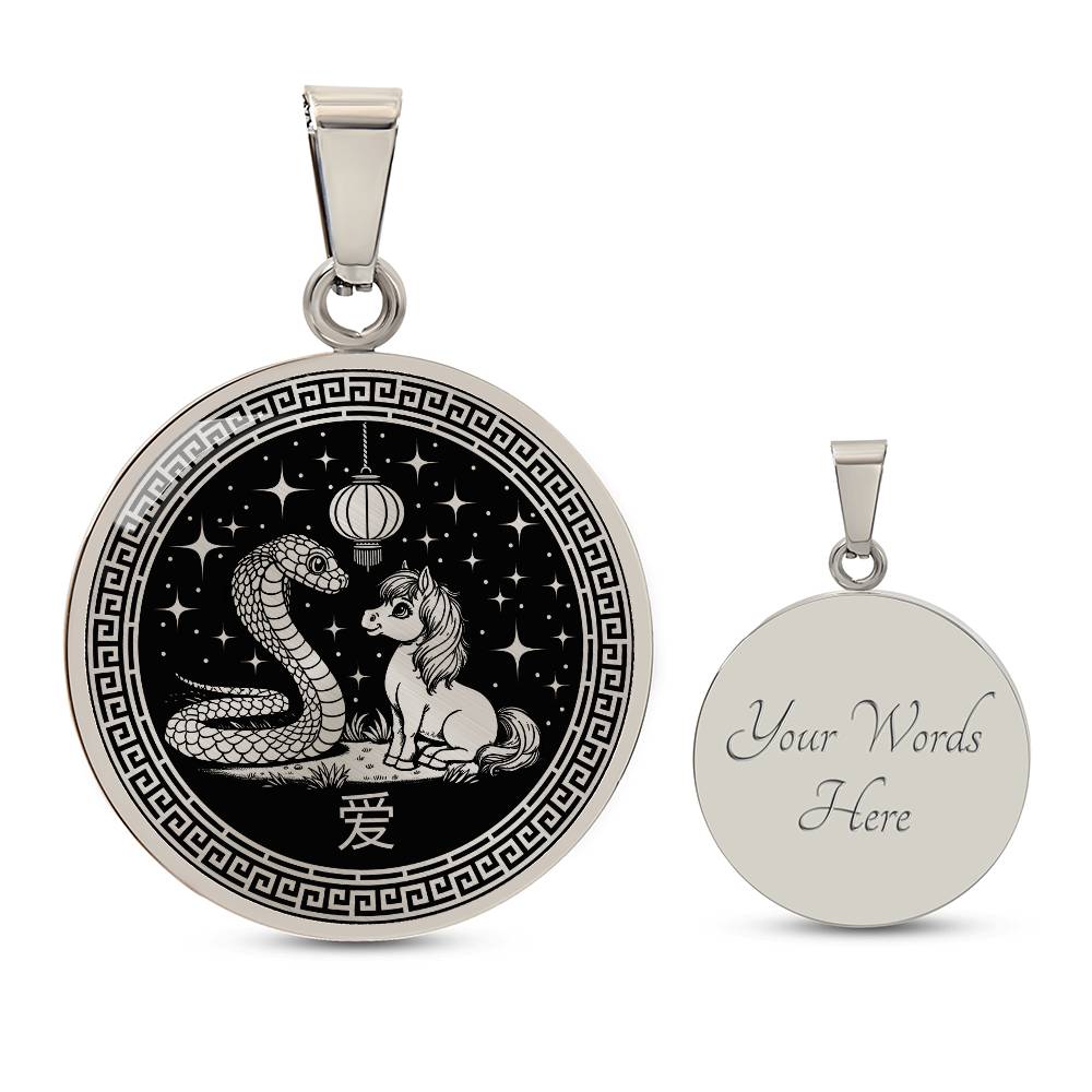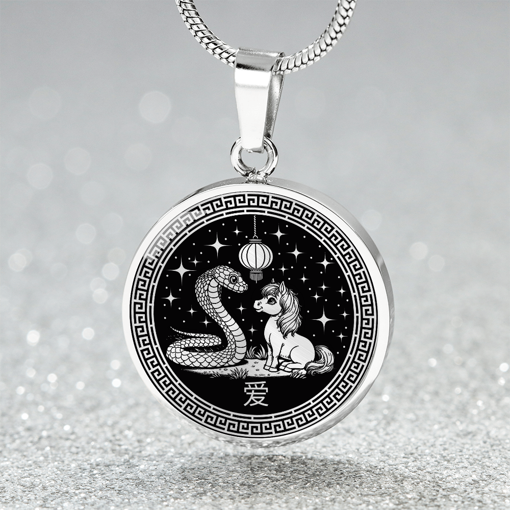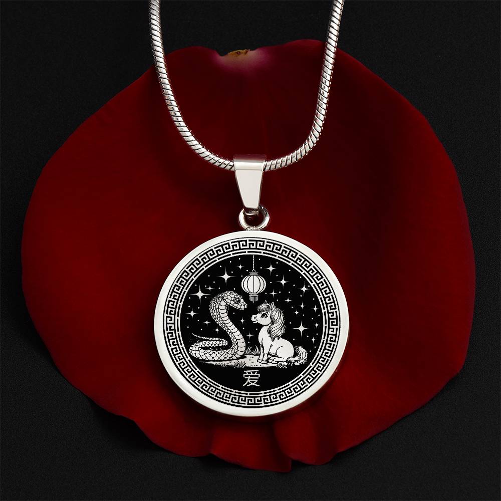 Year of the Snake Necklace, offering engraved personalization options and available in both silver stainless steel and 18K gold plated, this enchanting charm pendant features the Chinese symbol for Love 爱, along with the energetic horse and a wise snake, a harmonious fusion of freedom, wisdom and love. Whether bestowed as a cherished gift for her or him, shared between couples or worn as a lunar spirit companion, this necklace embodies the energy of the snake and the horse in the year 2025.