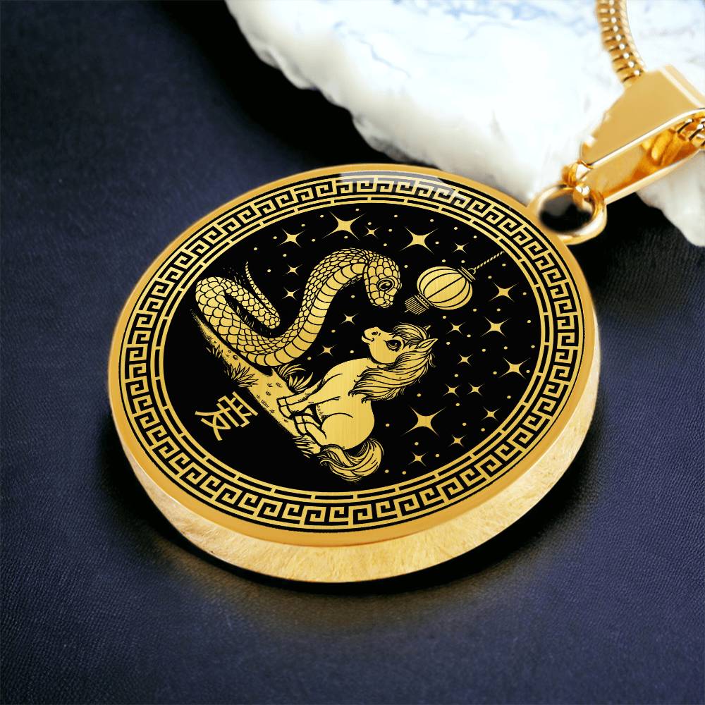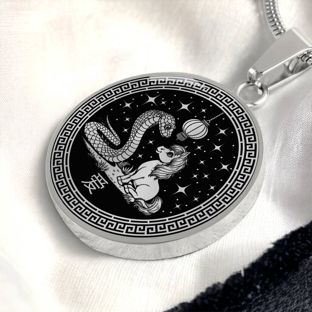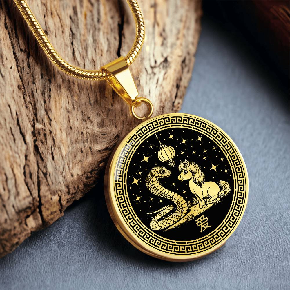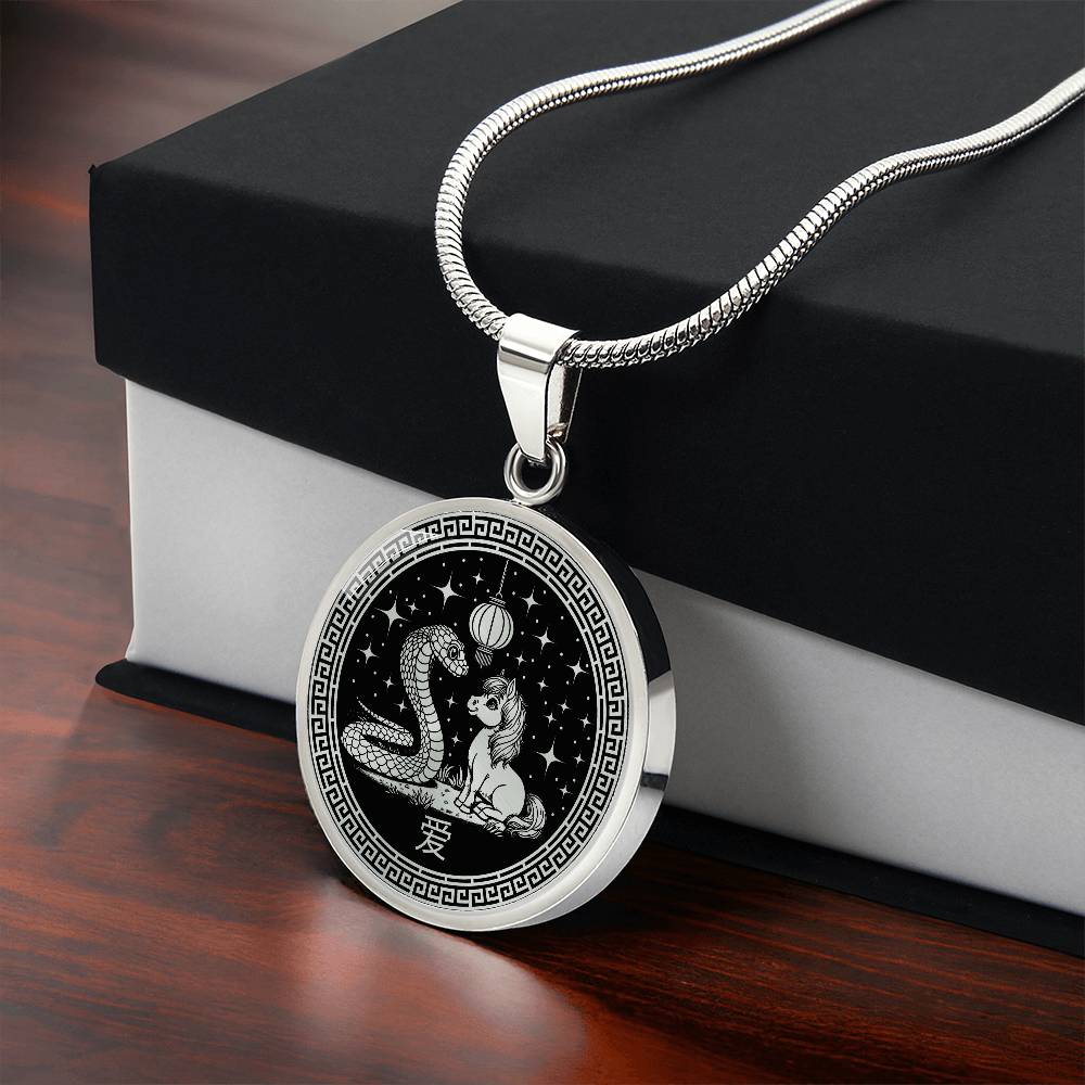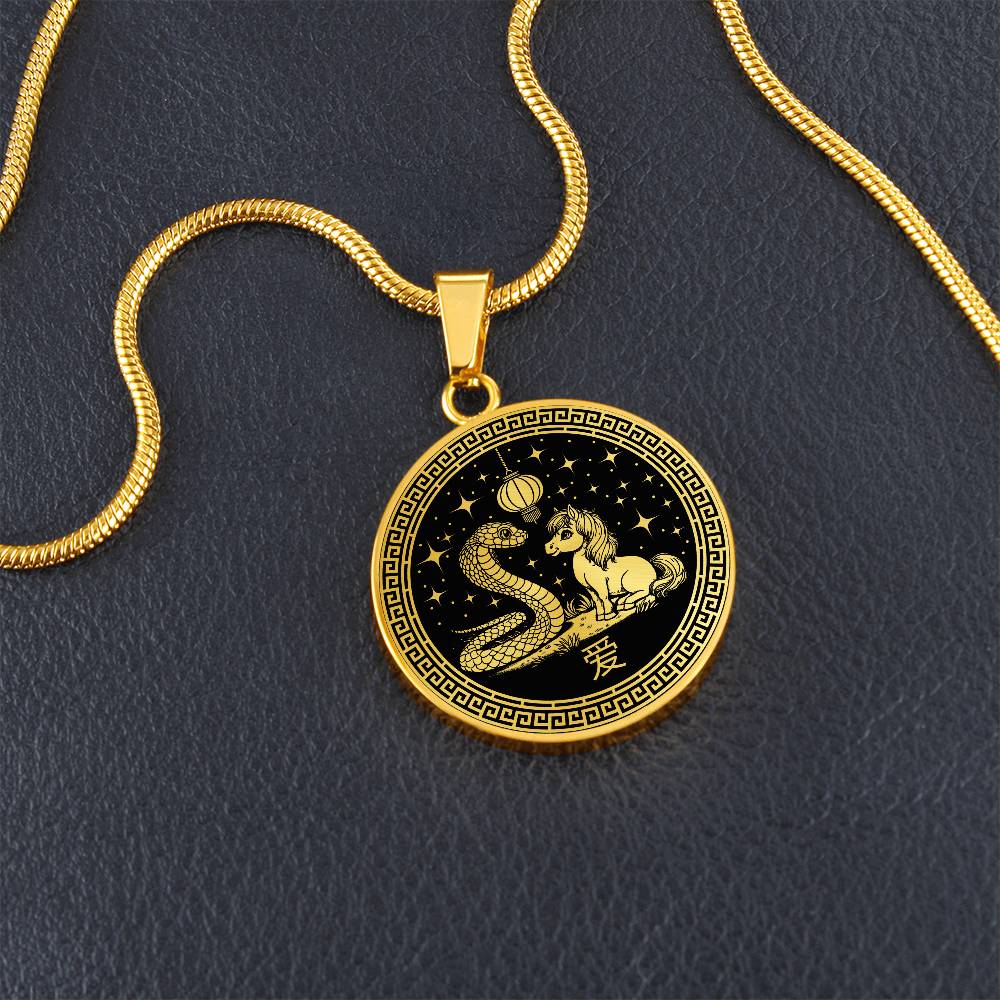 Year of the Snake Necklace, offering engraved personalization options and available in both silver stainless steel and 18K gold plated, this enchanting charm pendant features the Chinese symbol for Love 爱, along with the energetic horse and a wise snake, a harmonious fusion of freedom, wisdom and love. Whether bestowed as a cherished gift for her or him, shared between couples or worn as a lunar spirit companion, this necklace embodies the energy of the snake and the horse in the year 2025.